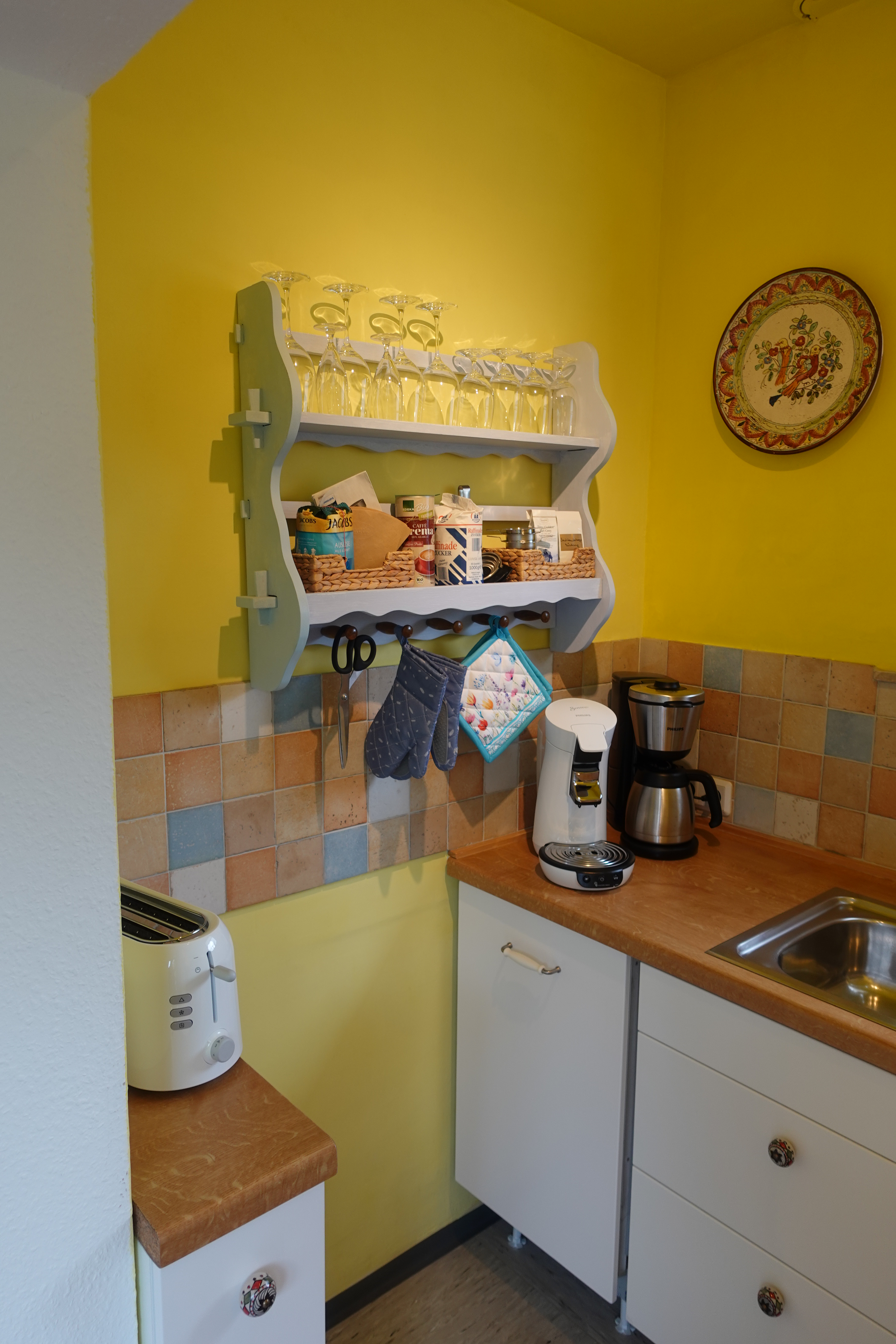 Die Küche bietet eine gut ausgestattete Küchenzeile mit Cerankochfeld, Backofen, Filterkaffeemaschine, Siebträgermaschine, Langschlitz-Toaster, Handmixer, Geschirrspüler, Wasserkocher mit Temperaturwahl, Geschirr für 6 Personen, div. Kochutensilien, Gewürze, Öl, Tee, Kaffee.